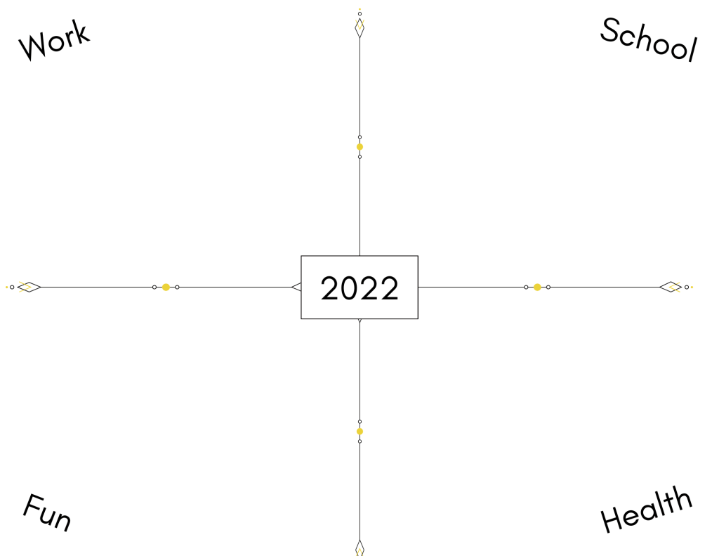 This one is a little bit more different. Instead of specific things that you want to do or achieve, you visualize how you want specific areas of your life to look like. The board is divided into four sections: School (if it still applies, you can change it for whatever you want), Work, Health, and Fun.