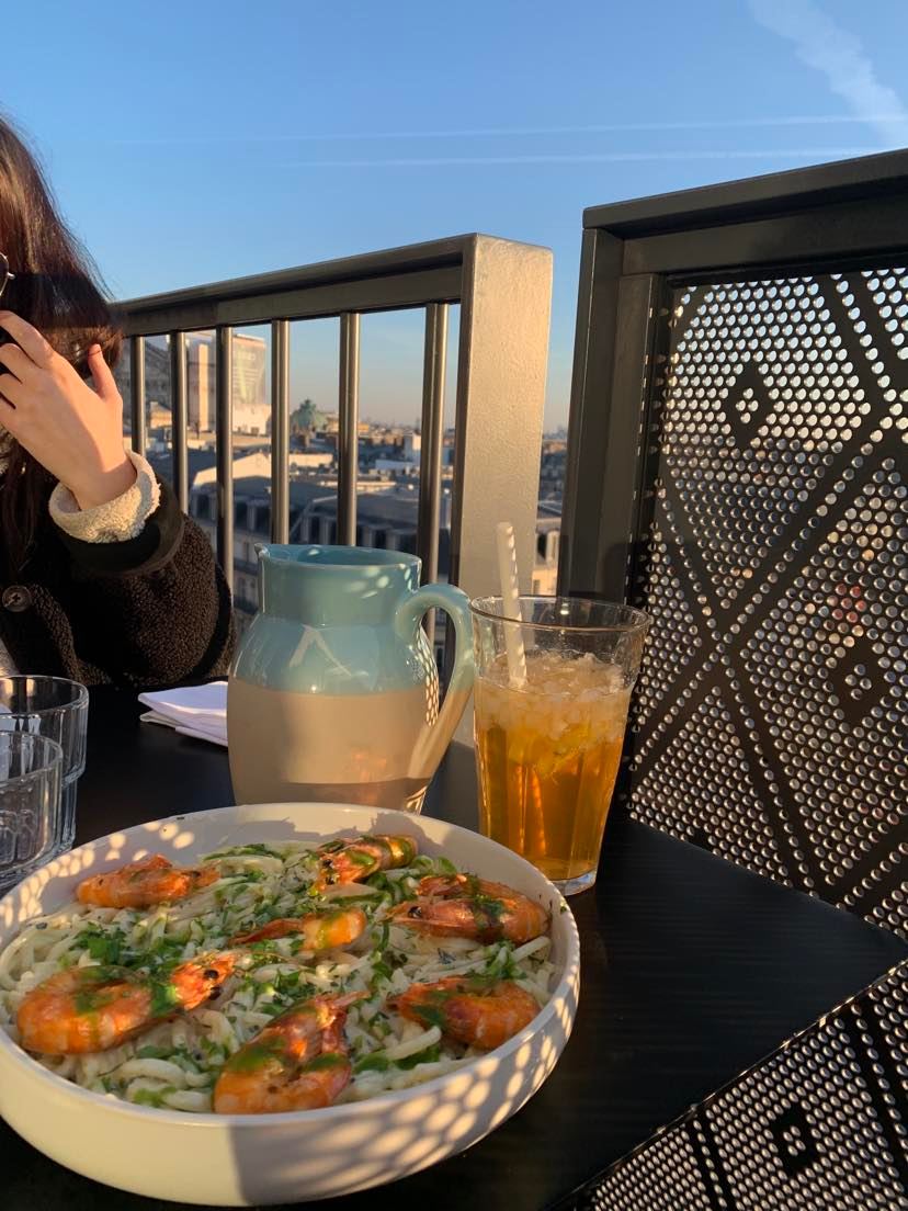Le Printemps Paris Haussmann is a gigantic department store that sells luxury products and clothes. The store has 27 floors, which are divided into three buildings. On top of this department store, a few restaurants offer a beautiful view of Paris. So if you want a place to watch the sunset with a drink and view on Paris (Emily in Paris vibes here), Le Printemps is the place to go. We went to La Reine Mer, a restaurant on the 8th floor, and the food was truly amazing.
