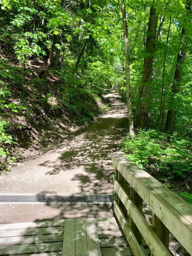 If you do La Falaise and Les Chutes combined, it is a little bit more than 5 km. Both trails are considered level difficult.