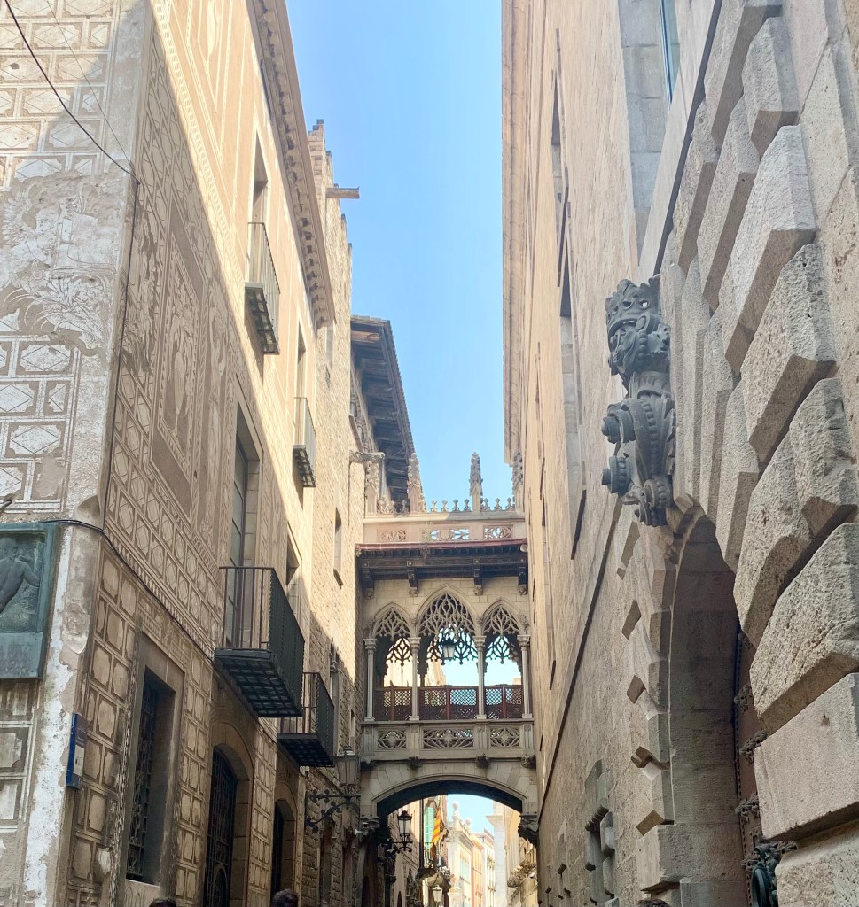 The Gothic Quarter is a beautiful neighborhood to spend an afternoon in the center of Barcelona. The narrow streets from medieval times, nice shops, free expositions, and restaurants will surely charm you. Look also at the stunning Gothic Cathedral, and take a picture with the famous Pont del Bisbe (Bishop’s Bridge).