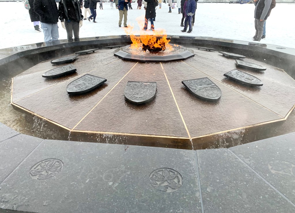 The day after the game, we decided to explore the city. We went to the Parliament and looked at the Centennial Flame, a monument on which you can see the shields of the ten provinces and three territories of Canada. Could you recognize all of them?
