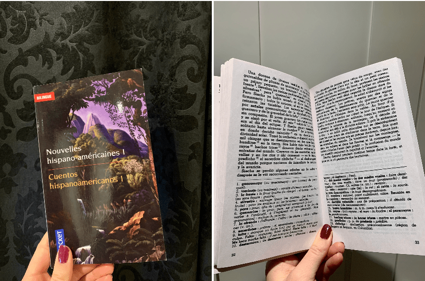 So how does it work? Well, on the left page, you have the text in Spanish, and on the right page, you have the exact text but in French (or English, depending on your choice). Also, various words are identified in the Spanish version with a number so that you can find the definition of these words at the bottom of the page. If you are still a beginner like me, I think the best way to read this kind of book is to read one sentence of the Spanish version at a time and look at the definition of the identified words. Then, confirm your understanding by reading the translation of the sentence.