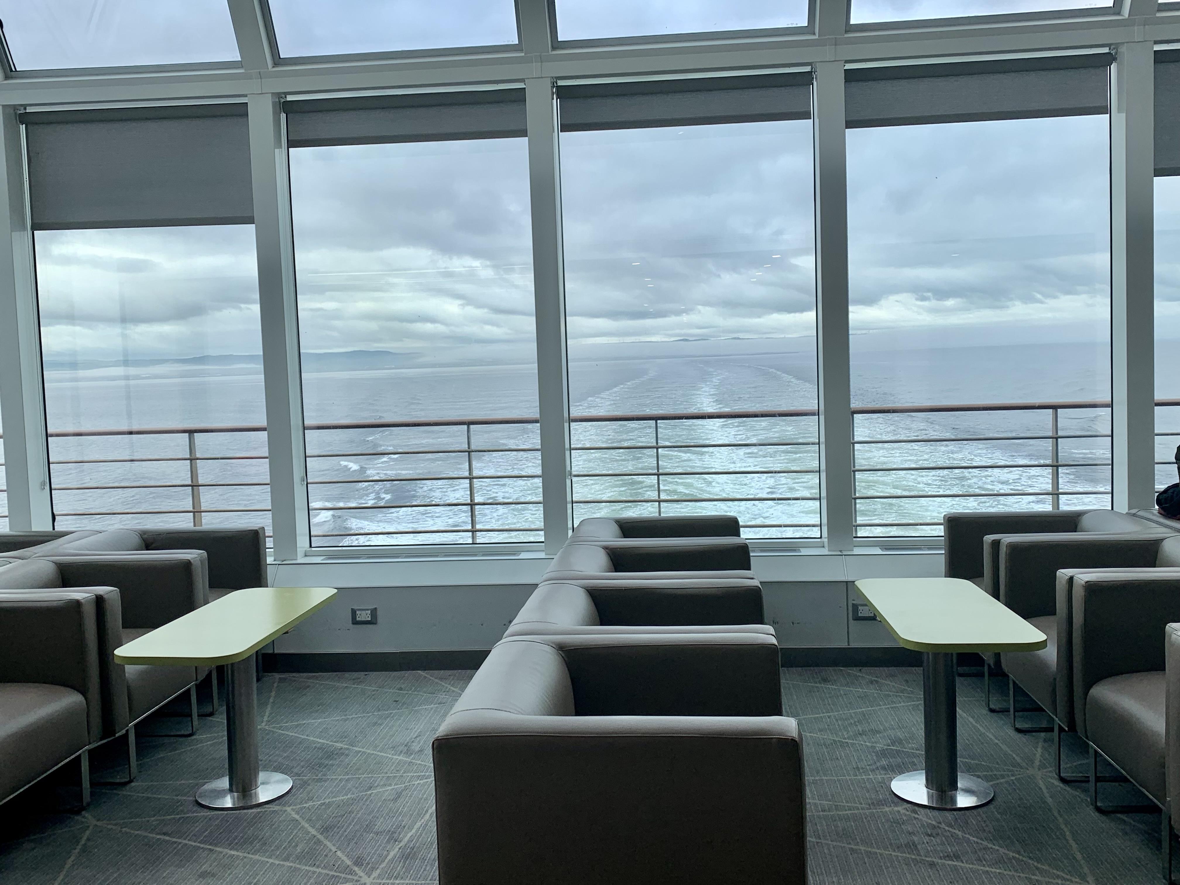 The crossing takes 2 hours and 10 minutes, and the boat has plenty of space for your car. There is a cafeteria on the ship, a boutique, a playing area for children, a big spacious deck, and many sitting areas. You might see some seals or whales during the ride if you are lucky!