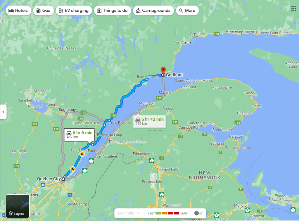The other option to get to Godbout is by road, including a ferry from Baie-Sainte-Catherine to Tadoussac. The crossing is only 10 minutes and is free of charge. As you can see on the map, it takes less time than the first option. For the ferry schedule, click here.